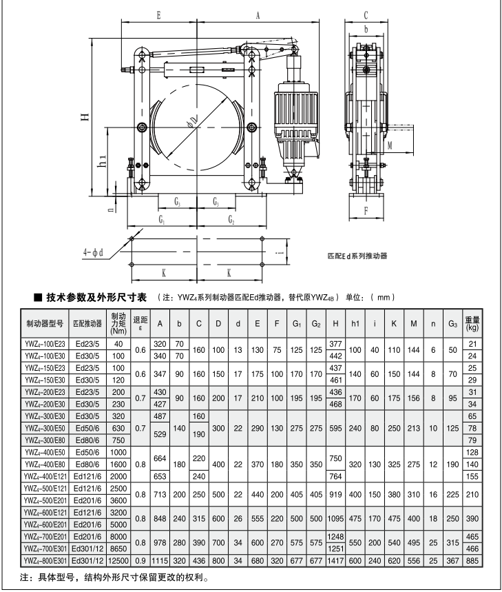 電力液壓制動器是使機械中的運動件停止或減速的機械零件。俗稱剎車、閘。制動器主要由制架、制動件和操縱裝置等組成。有些制動器還裝有制動件間隙的自動調整裝置。為了減小制動力矩和結構寸, 制動器通常裝在設備的高速軸上,但對性要求較高的大型設備(如礦井提升機、電梯等)則應裝在靠近設備工作部分的低速軸上。有些制動器已標準化和系列化,工廠制造以供選用。