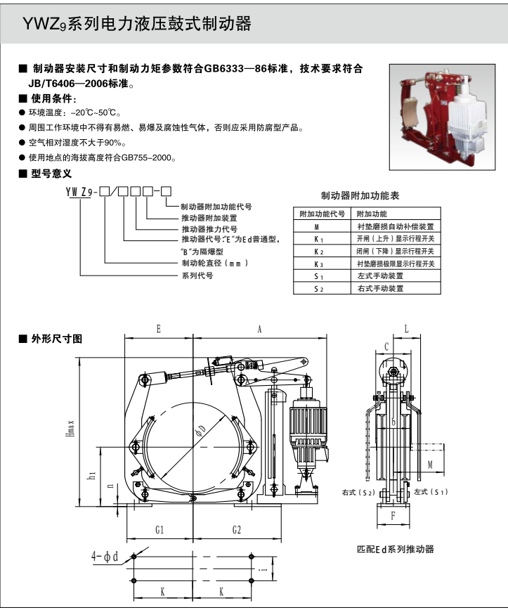 電力液壓制動器是使機械中的運動件停止或減速的機械零件。俗稱剎車、閘。制動器主要由制架、制動件和操縱裝置等組成。有些制動器還裝有制動件間隙的自動調整裝置。為了減小制動力矩和結構寸, 制動器通常裝在設備的高速軸上,但對性要求較高的大型設備(如礦井提升機、電梯等)則應裝在靠近設備工作部分的低速軸上。有些制動器已標準化和系列化,工廠制造以供選用。